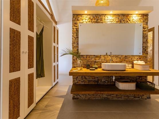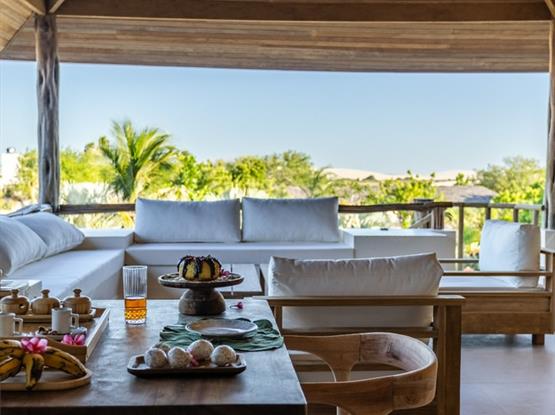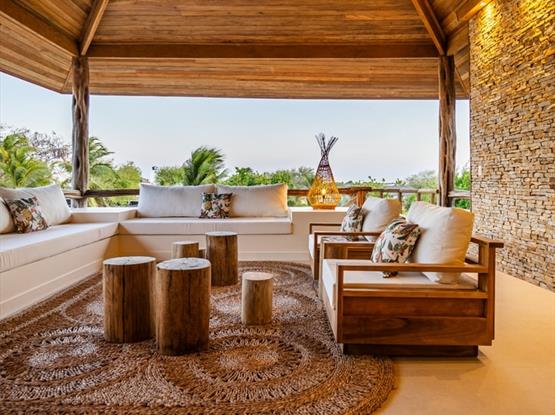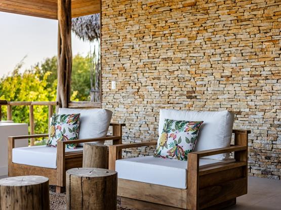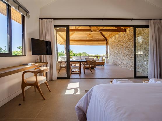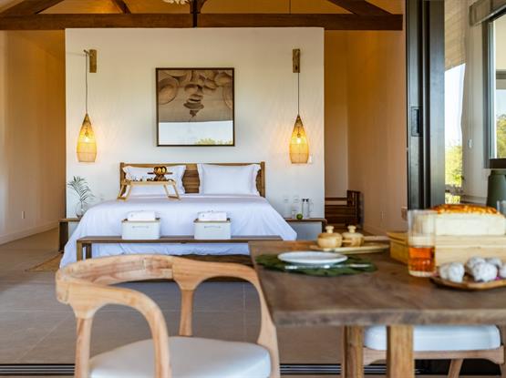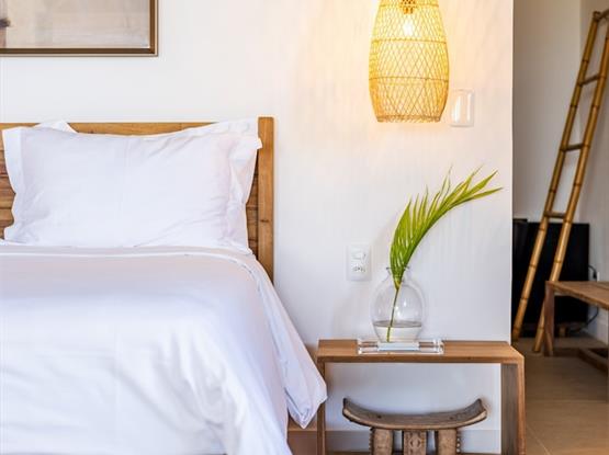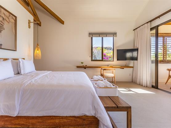 A Suíte Master Flamboyant, com 55m², oferece conforto e exclusividade em cada detalhe. Equipada com uma espaçosa cama king size, proporciona uma vista encantadora para o terraço privativo, onde mesas e sofás convidam ao relaxamento diante do cenário deslumbrante das dunas do Parque Nacional de Jericoacoara.