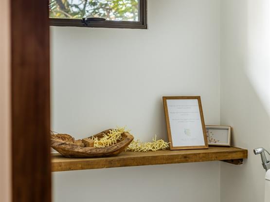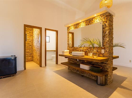 O amplo banheiro conta com duas pias, dois chuveiros e sanitário independente, garantindo praticidade e privacidade.