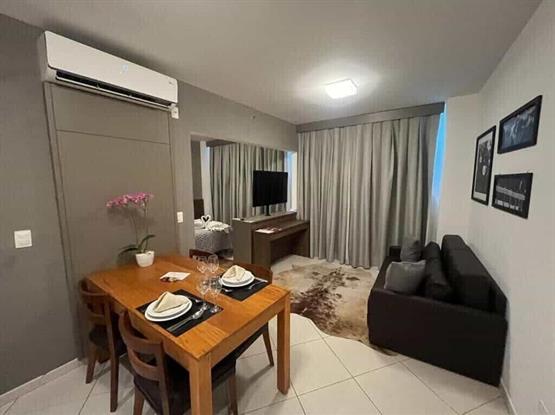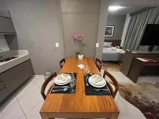A Suíte Flat Studio Superior – Vista Piscina possui 39 m² de área privativa, com ambientes integrados que oferecem conforto e praticidade. Conta com sala de estar equipada com sofá-cama, tapete, mesa de centro, aparador e TV Android 50” 4K giratória, integrada à cozinha funcional com armários, micro-ondas, frigobar e mesa de jantar montada com louças e talheres para até 4 pessoas.