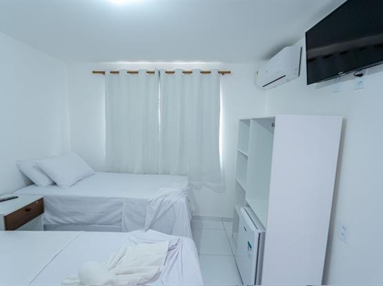 A categoria oferece cama de casal ou duas camas de solteiro, com possibilidade de cama extra (mediante disponibilidade), além de ar-condicionado, TV, frigobar, Wi-Fi gratuito e banheiro privativo com amenities. O ambiente é amplo, bem iluminado e proporciona maior conforto para estadias mais longas ou para quem prefere um espaço extra para relaxar.