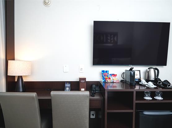 Os quartos Super Luxo, com 18m², estão localizados no 14º andar e possuem piso frio. Oferecemos chaleira e cafeteira com 2 cápsulas Nespresso cortesia, Smart TV com canais a cabo e uma garrafa de água cortesia por estadia. Além disso, disponibilizamos uma linha completa de amenities, balança, secador de cabelos profissional, mesa de trabalho e enxoval diferenciado. Para o seu conforto, apresentamos um menu de travesseiros.