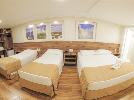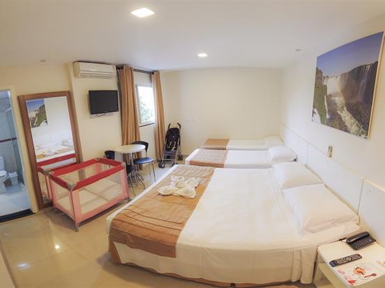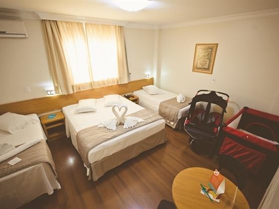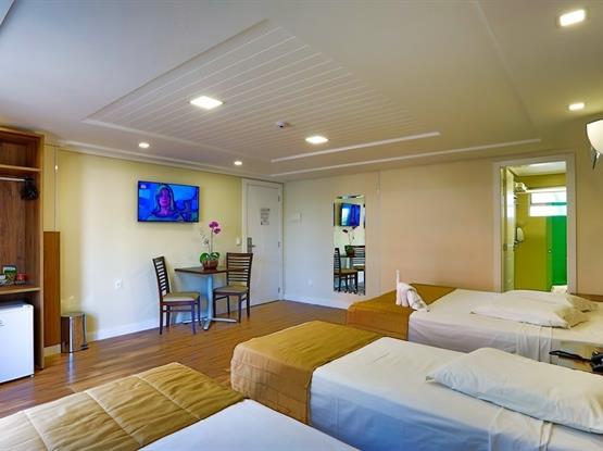 Apartamento Quádruplo Casal com 1 cama de Casal + 2 camas de Solteiro. (Gratuidade de 01 criança de até 04 anos no mesmo apartamento de 04 pagantes, dormindo na cama com os pais em camas já existentes no apartamento)