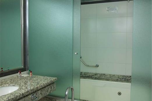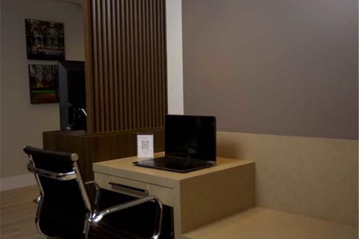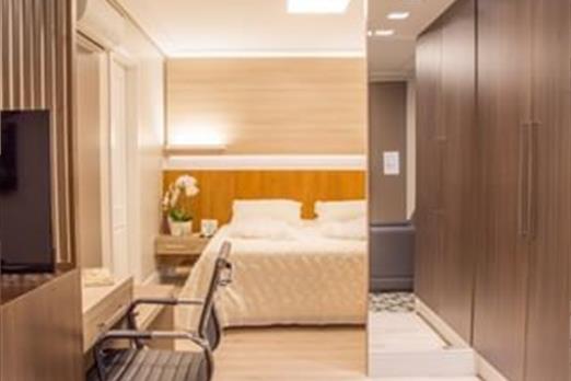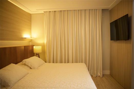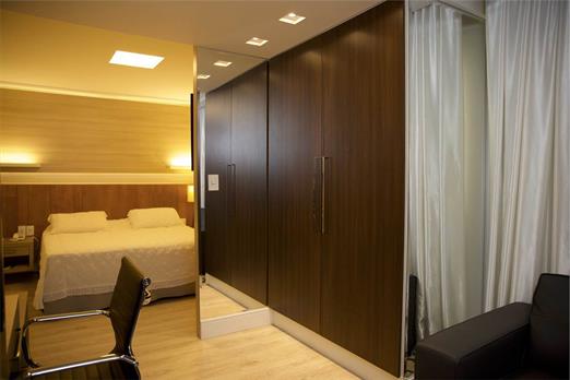 Com aproximadamente 23m², a suíte conta com dois ambientes integrados: antessala com sofá, mesa de trabalho e TV a cabo; O quarto conta com uma Cama Casal tamanho...