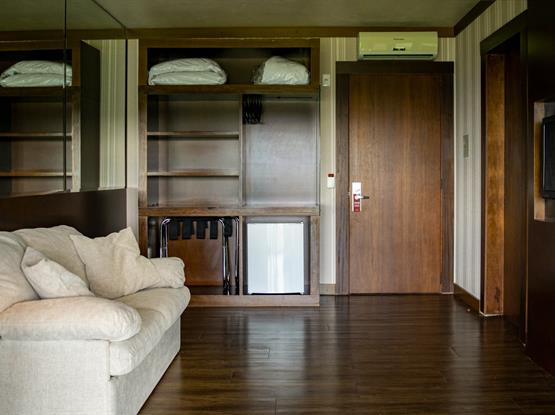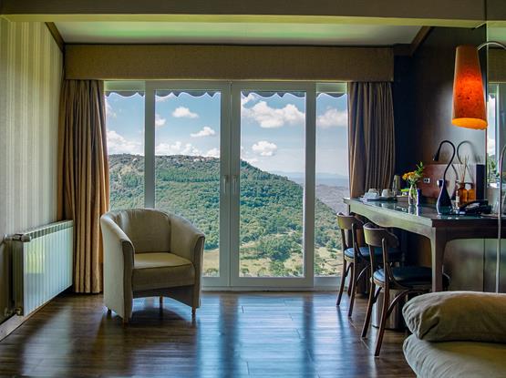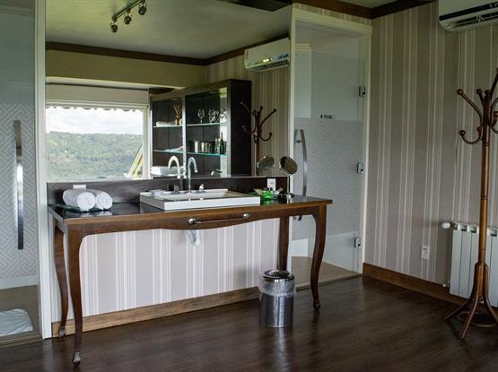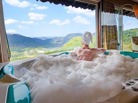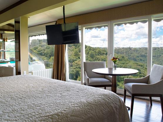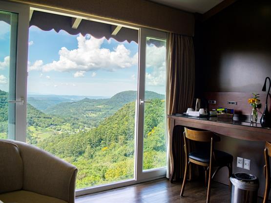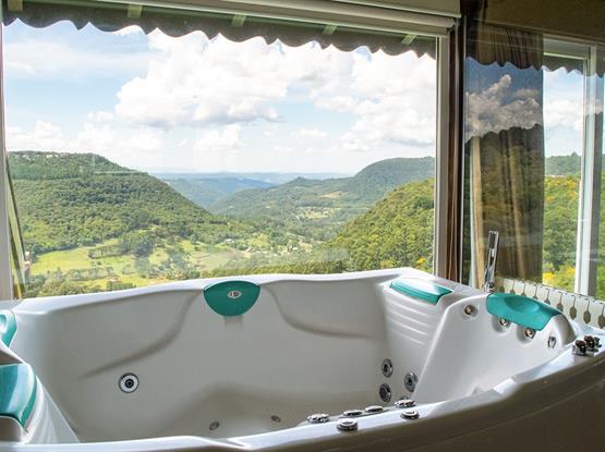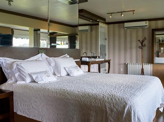 Com 68m² e 11m de vista frontal para um dos mais belos cenários de Gramado, o Vale do Quilombo. Acomoda confortavelmente até 5 pessoas em dois ambientes privativos. Está equipada com Tv de Led 42 na suíte e de 32 na sala de estar, calefação, ar condicionado, telefone, frigobar, cofre, jarra elétrica com chás, secador de cabelos e acesso à internet. A banheira de hidromassagem com cromoterapia para duas pessoas e a cama King Size para o casal tornam o ambiente romântico e acolhedor, com sofá-cama para as crianças. Ambos os banheiros trazem amenities L'Occitane. Chinelos, roupões e serviços diferenciados estão à disposição para sua estada.