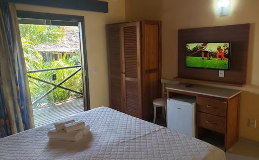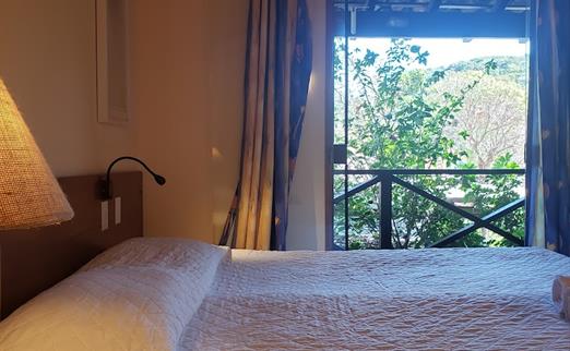 São apartamentos confortáveis, com decoração estilo rústico praiano, que acomodam até 03 pessoas em uma cama de casal king size com capa pillow top e uma cama de solteiro no mesmo ambiente.