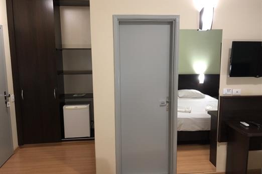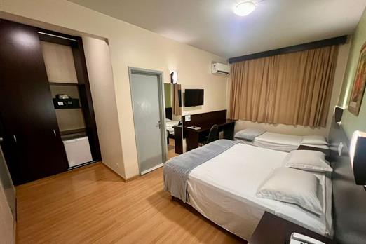 Apartamento Triplo moderno com 20 metros quadrados para 03 pessoas. O apartamento possui Ar Condicionado Split Inverter, TV LED 32 polegadas, Frigobar, secador de cabelo, telefone, com tomadas 110v e 220v, tomadas USB para carregar aparelhos eletrônicos e Wi-Fi.