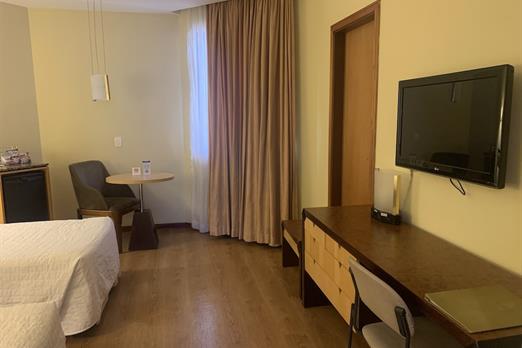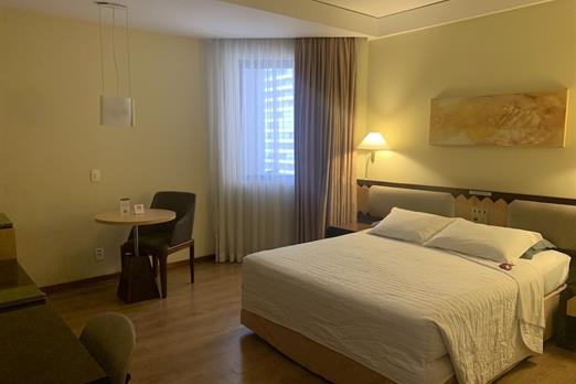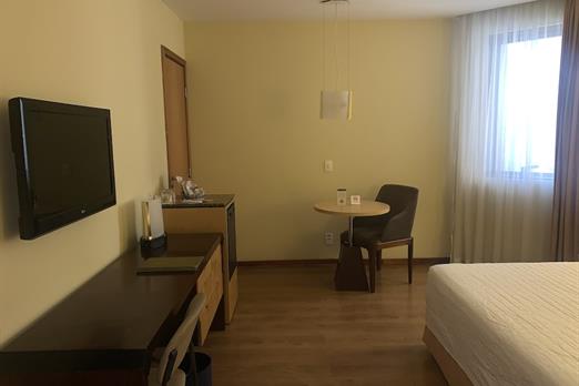 Apartamento com 1 quarto confortável com toda infra estrutura como: piso vinílico claro, cama casal box, TV de 40" com um leque mais completo de canais a cabo, frigobar, cofre digital, ar condicionado com ionizador de ambiente, Wi-fi grátis, banheiro com banheira e kit de amenities. Cama casal com porta que se comunica com outro apartamento (não incluso nessa diária), que se usado individualmente será mantida trancada dos dois lados.