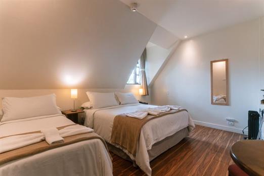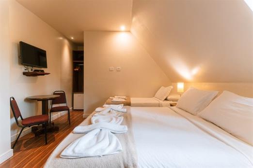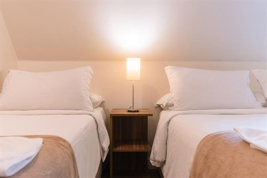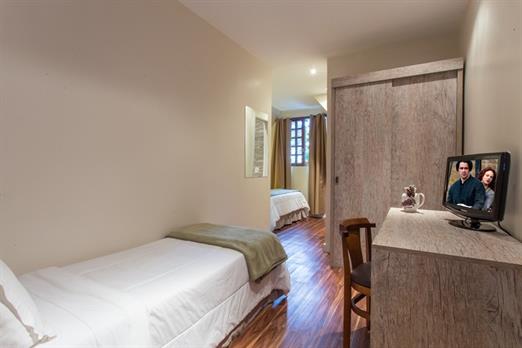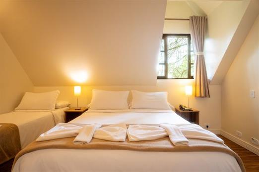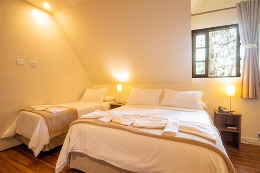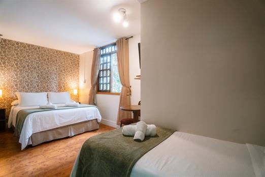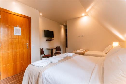 Os apartamentos estão localizados no andar superior, com acesso por escada (2 lances). Possuem cama box, lençóis 100% algodão (190 fios), SMART TV LG 32' com canais Sky, frigobar, telefone, revestimento térmico e aquecedor, armários, cortina blackout, WIFI, piso laminado antialérgico, chuveiros pressurizados, ducha higiênica, secador de cabelo, serviço de arrumação todos os dias e recepção 24 horas. Com café da manhã servido das 8h às 11h. Pode ser montado com 3 camas de solteiros ou 1 cama de casal e 1 de solteiro (solicitar alteração no ato da reserva). Os apartamentos podem sofrer variações na sua metragem e disposição dependendo da localização em que se encontram na pousada.