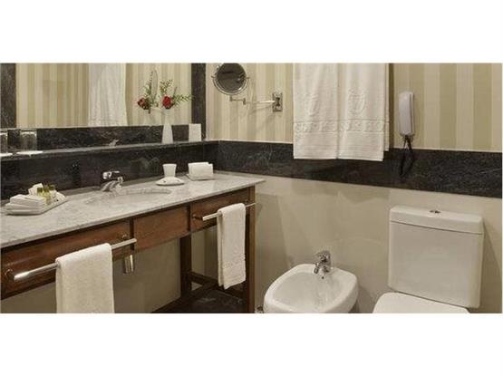 O banheiro privativo em granito oferece box de vidro, secador de cabelo, espelho de maquiagem, além de kit de amenities.