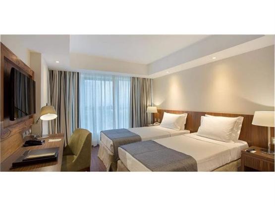 Moderno apartamento com vista para a cidade que comporta até 3 pessoas. O ambiente oferece 2 camas de solteiro e possibilidade de cama extra, TV a cabo, frigobar, poltrona, cofre eletrônico e ar condicionado que se desconecta automaticamente quando a janela antirruído é aberta. O local também é ideal para trabalhar, já que possui acesso à internet, iluminação individual para leitura, bancada e mesa de trabalho.