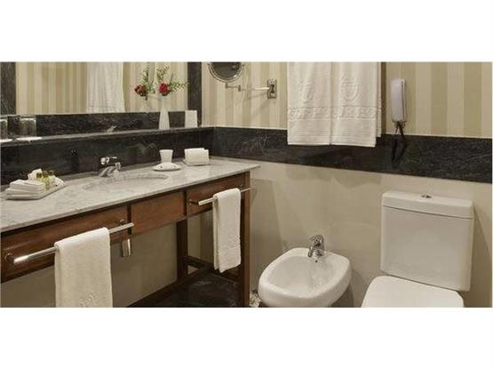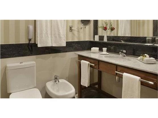 O banheiro privativo em granito oferece box de vidro, secador de cabelo, espelho para maquiagem, além de kit de amenities.