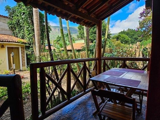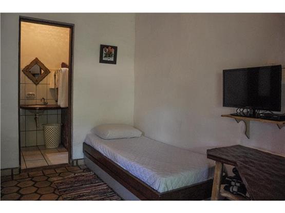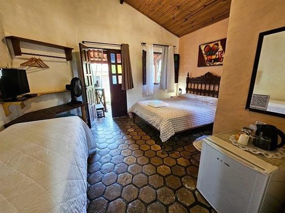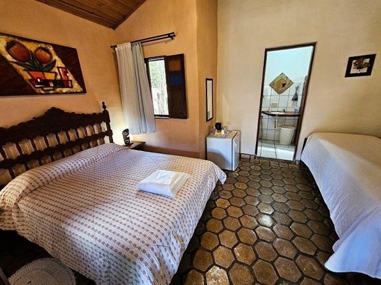 Quarto Aconchegante, Tarifa Tripla ou Dupla a depender da quantidade de pessoas, andar térreo, com 1 cama de casal e 1 cama de solteiro, com varanda , vista para o jardim, colchão Tv , frigobar, secador de cabelo, colçhão de 5 estrelas, ducha forte com aquecimento solar, telas mosquiteira nas janelas, forro no teto e ventilador de mesa.