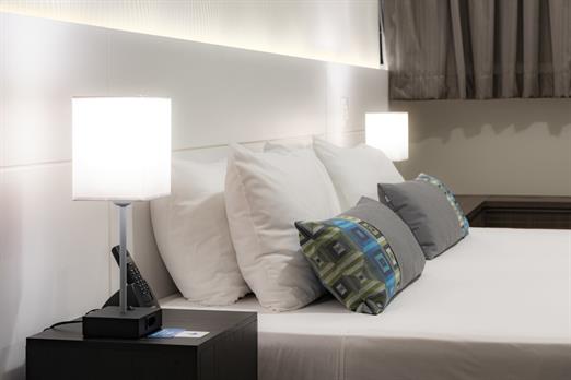 Apartamento com decoração contemporânea, piso frio, cama box casal, poltrona para descanso com puff, TV por assinatura, janela antirruído, armário com cabide, cofre, internet Wi-Fi gratuita, telefone com discagem direta do quarto, ar condicionado central, mesa de trabalho, tomada USB, abajur com tomada, frigobar, ducha com aquecimento central, box de vidro, secador de cabelo, espelho de aumento bidet.