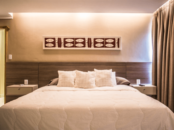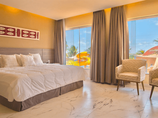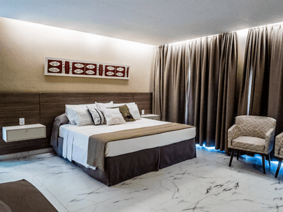 Esta unidade habitacional, dispõe de 01 (uma) cama King e 01 Bicama (02 camas de solteiro) no quarto principal, e 01 cama casal King no quarto secundário, atendendo duplo, triplo, quádruplo, quíntuplo e sêxtuplo, sendo cobrado por número de pessoas.