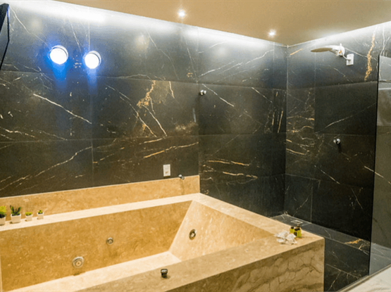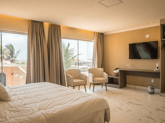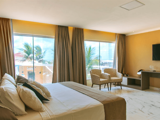 Amplo apartamento com área de estar, quarto principal, quarto secundário e vista para o mar. Nosso maior apartamento, procurado por quem procura exclusividade e requinte. Equipado com TV LCD em todos os cômodos, inclusive no banheiro, conta ainda com dois acessos exclusivos, um para o clube e outro para o hotel. Com frigobar, cofre exclusivo, ducha quente e fria, banheira, ar condicionado em todos os cômodos, armários espaçosos, mesa, cadeiras, sofás e poltronas.