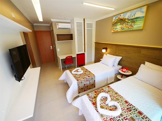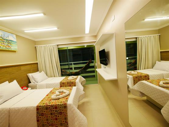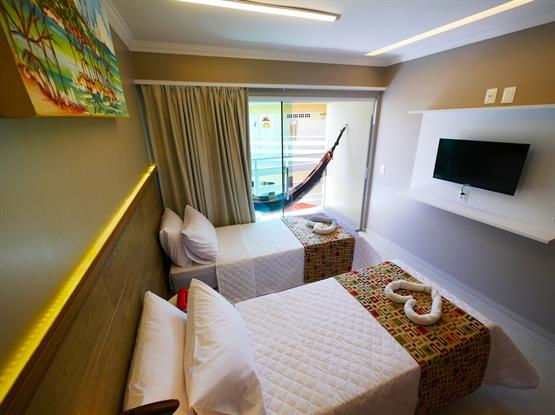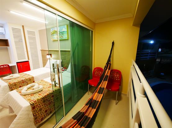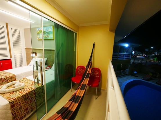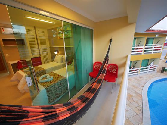 APARTAMENTOS MASTER SOLTEIRO DUPLO C/ VARANDA destinadas a acomodar 2 solteiros. Este possui varanda com vista para a piscina.