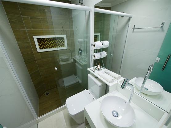 •Banheiro privativo com água quente no chuveiro e box em vidro temperado.