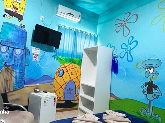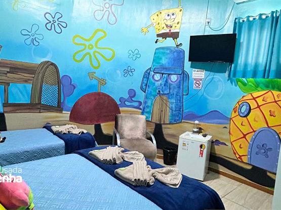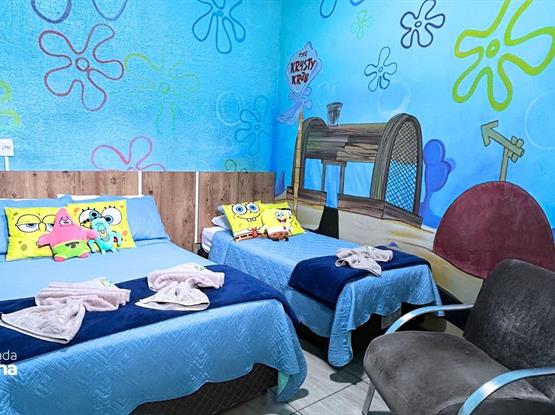 A suíte Fenda do Bikini, inspirada no famoso desenho animado “Bob Esponja Calça Quadrada”, é um conceito criativo que transporta os hóspedes para o mundo subaquático e vibrante da da Fenda do Bikini. A suíte foi decorada com elementos que remetem ao mar, e o estilo alegre e peculiar dos personagens do desenho. É uma opção divertida e nostálgica para fãs do desenho que desejam mergulhar em uma experiência temática única e memorável. Configuração: 1 Cama Box Casal + 1 Cama Box Solteiro