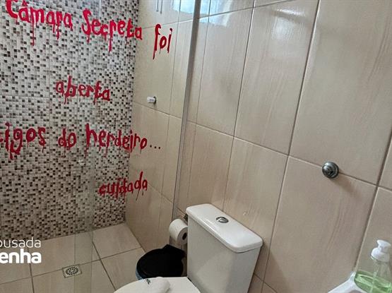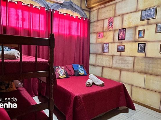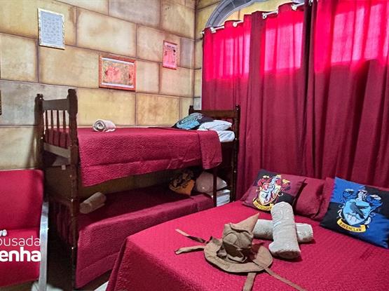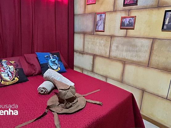 Uma suíte temática inspirada em Harry Potter pode ser um verdadeiro sonho para fãs da saga. Ao entrar na suíte, os hóspedes são transportados para o mundo mágico de Hogwarts. As paredes imitam a do Salão Comunal de Grifinória, com escudo, bandeiras e retratos animados de personagens icônicos. Uma estante com varinhas, Caldeirão e outros acessórios mágicos fazem parte da decoração. Para completar a experiência, o banheiro tem elementos que lembram a Câmara Secreta. A iluminação é suave e possui velas flutuantes, que acendem a um passe de mágica e dão o toque final para uma imersão completa no universo de Harry Potter. Configuração: 1 Cama Box Casal + 1 Beliche