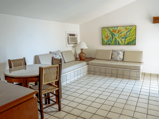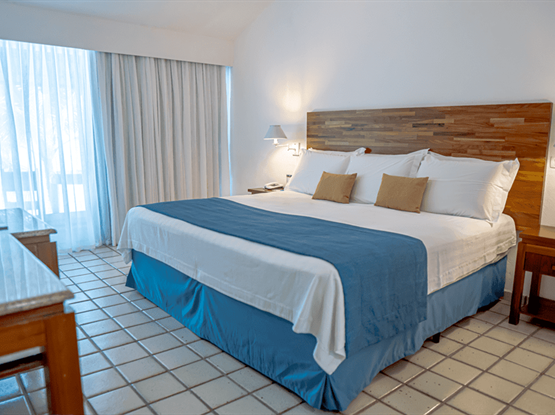 O quarto acomoda até 03 adultos e 02 crianças de até 07 anos, esta unidade possui 01 cama king no quarto mais 02 sofás cama de alvenaria na antessala.
