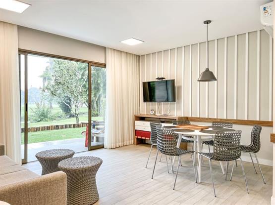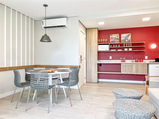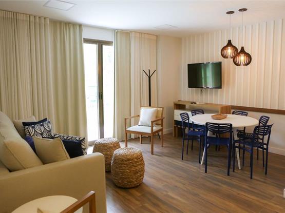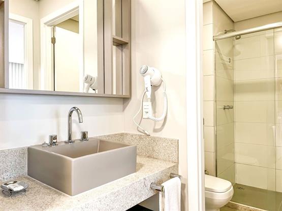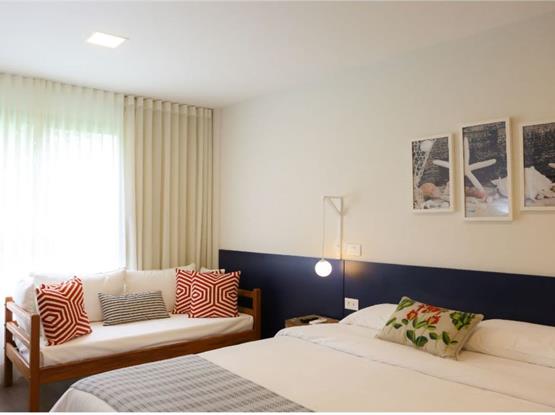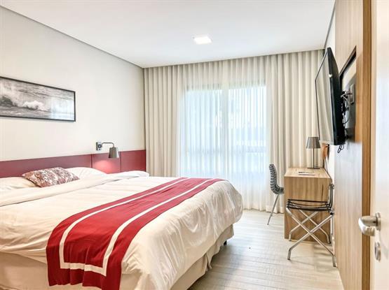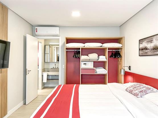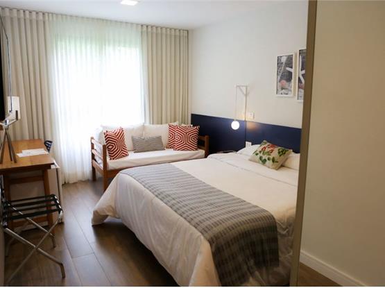 - Um Sala/Quarto com sofá cama casal e copa americana. No Quarto com cama casal King Size e Sofá Cama Solteiro, office, cofre, tomadas USB. Lavabo e Banheiro.