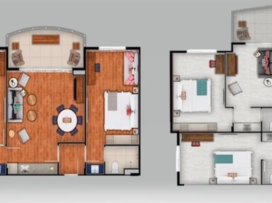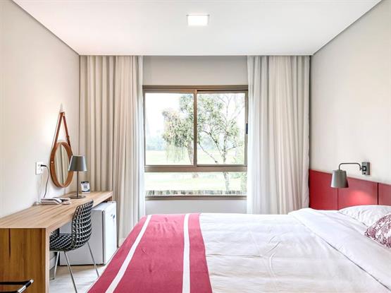 - Uma suíte No mesmo ambiente, porém com acesso independente, com a mesma disposição do quarto, com acréscimo de um frigobar, Lavabo e Banheiro.