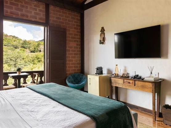 Quarto 1 - cama de casal, mesinha de cabeceira, Smart TV 55" com canais a cabo, guarda roupa, ar condicionado quente e frio, frigobar e cafeteira.