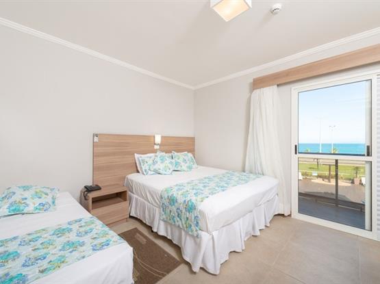 Todas as suítes possuem cama box com colchão de molas. As suítes são equipadas com frigobar, telefone, ar-condicionado, TV de LCD 32” e canais por assinatura, cofre eletrônico, armário, banheiro com secador de cabelos, ducha íntima, chuveiro com aquecimento central. Todas as suítes tem varanda com vista para o mar ou jardim. Decoração contemporânea e internet sinal variável.