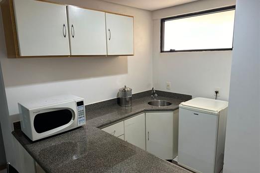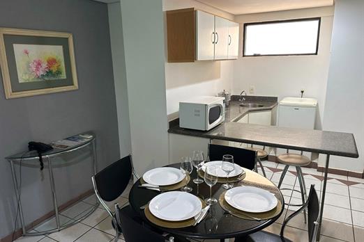 Possuiu uma mini-copa com microondas, utensilios, frigobar e bancada. A sala dupla dispõe um jogo de mesa de jantar.