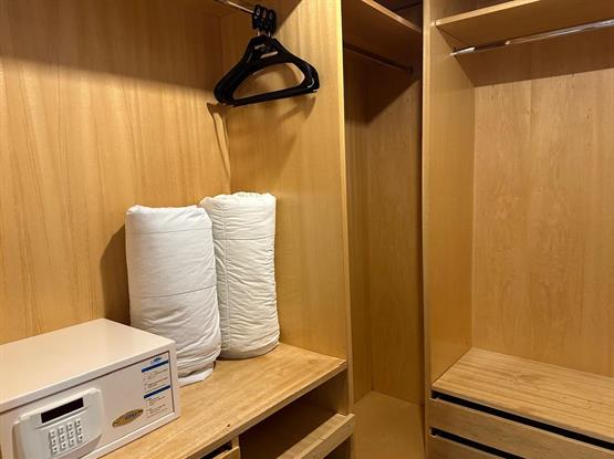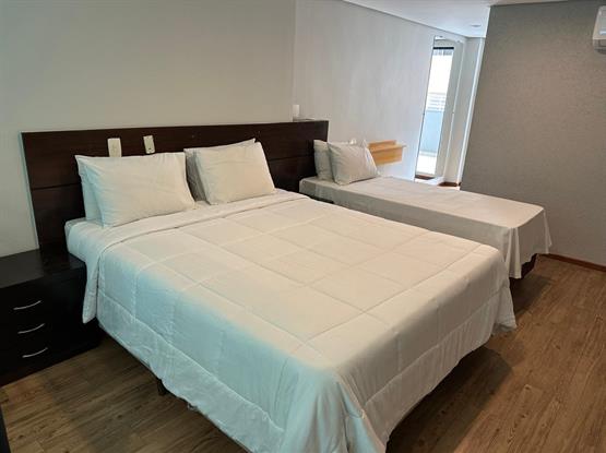 O quarto possui uma cama queen size e uma cama de solteiro, ar-condicionado split de 18.000 btus, tv lcd, cofre. Sacada com vista da cidade (180º); Banheiro com secador de cabelos.