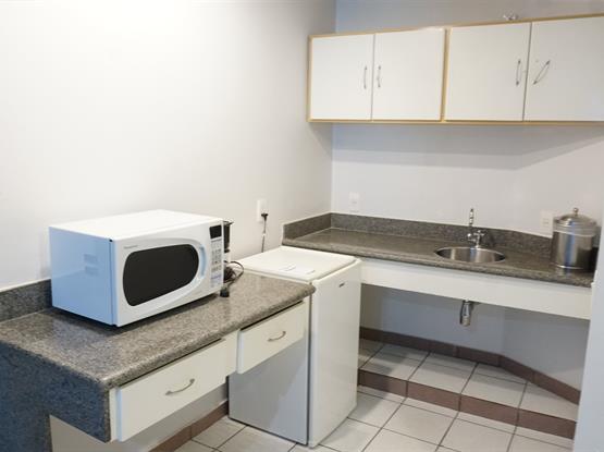 Possui uma mini-copa com bancada, microondas, frigobar e pratos/talheres. A sala dupla dispõe de sofá e um jogo de mesa de jantar.