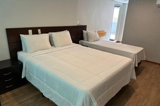 O quarto possui uma cama queen size e uma cama de solteiro, ar-condicionado split de 18.000 btus, tv lcd, cofre. Sacada com vista da cidade (180º); Banheiro com secador de cabelos.