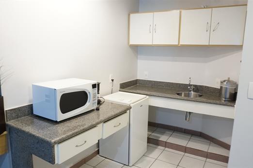 Possui uma mini-copa com bancada, microondas, frigobar e pratos/talheres. A sala dupla dispõe de sofá e um jogo de mesa de jantar.