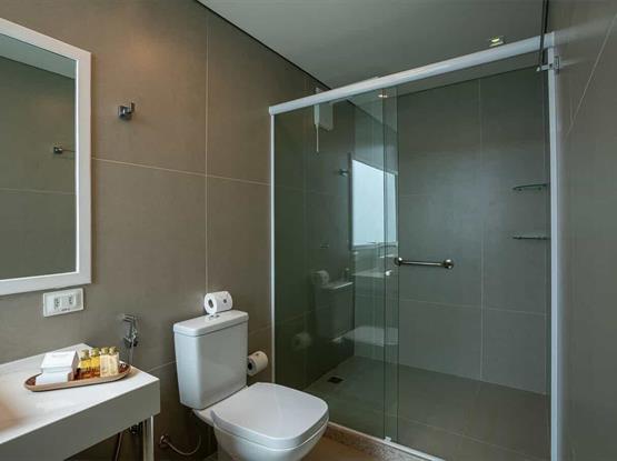 Nossos Apartamentos tem TV de Led de 50", SKY, ar condicionado Split, frigobar, secador de cabelo, armario, poltrona para leitura, máquina de café Nespresso, travesseiros de mais de uma altura, todo o enxoval da Budmeyer (lençol, colcha, toalhas, etc), ammenities da L'Occitane, banheiro com balcão de granito, blindex e chuveiro com agua quente.