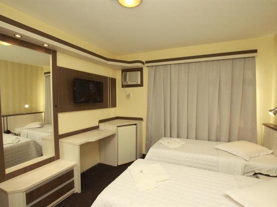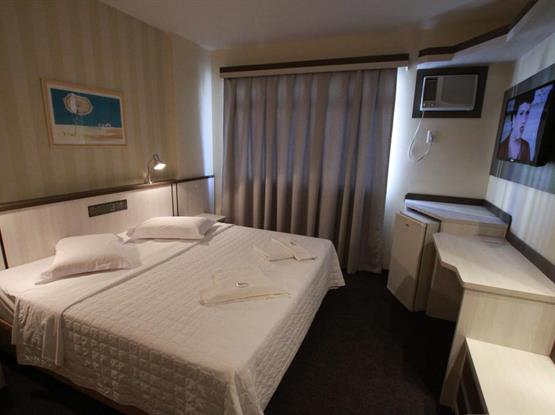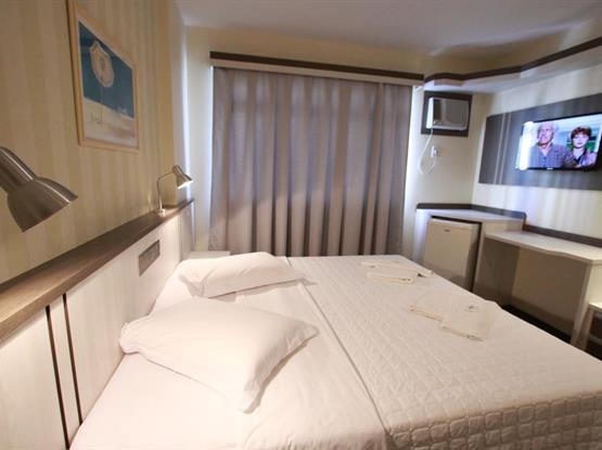 Apartamentos com ar condicionado, TV a cabo, cama box, musica ambiente, frigobar, bancada para trabalho, internet sem fio, cofre...
