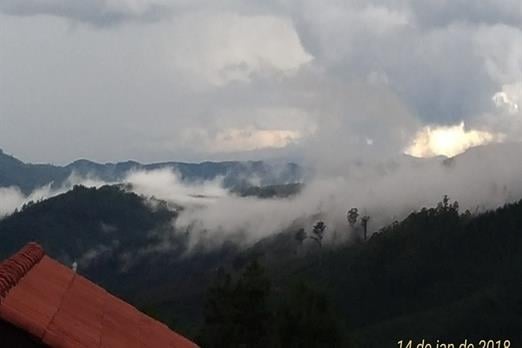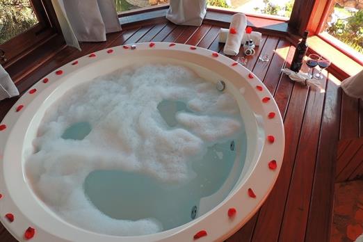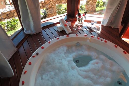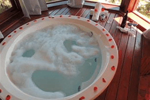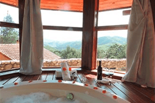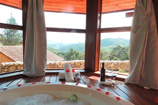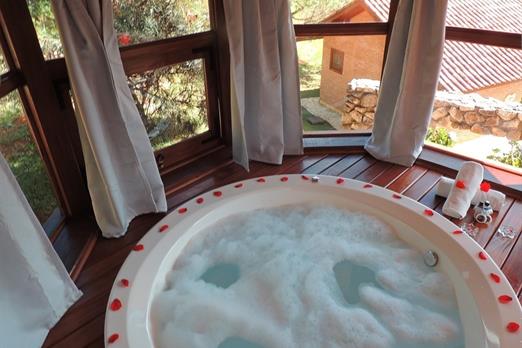 Chalé com hidromassagem redonda (jacuzzi), romântica e privativa com uma linda vista das montanhas de dentro da hidromassagem.