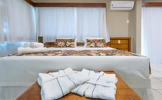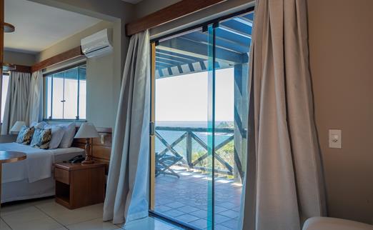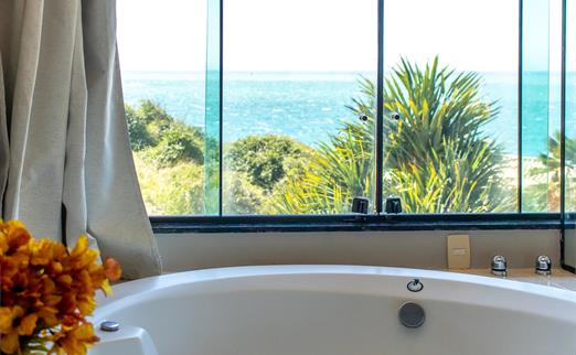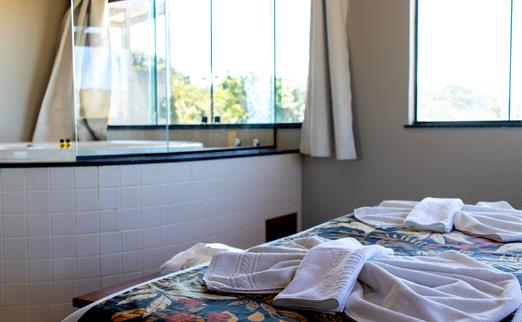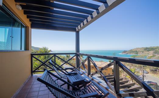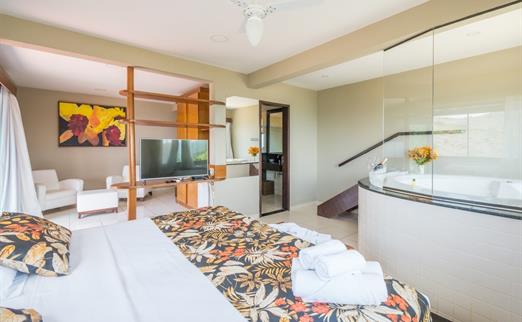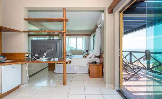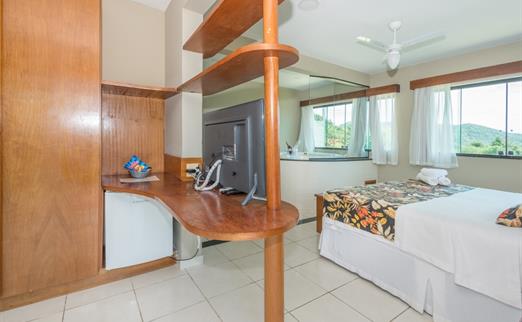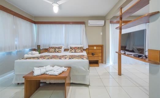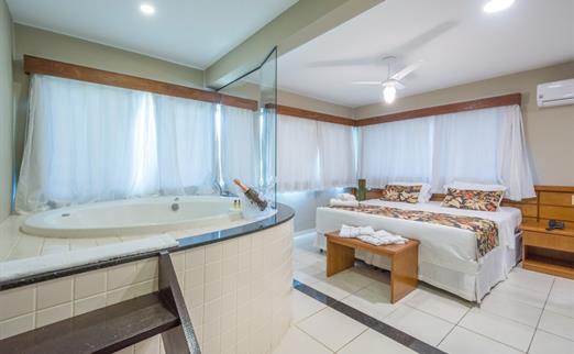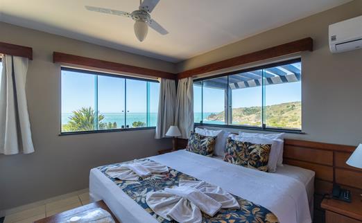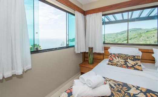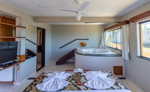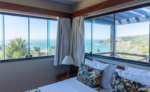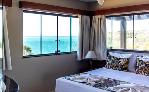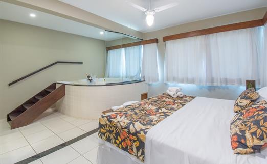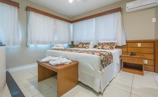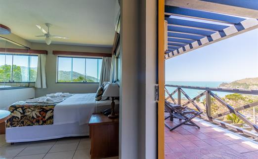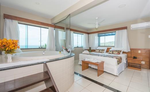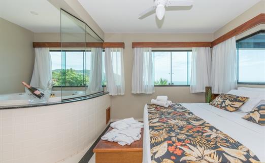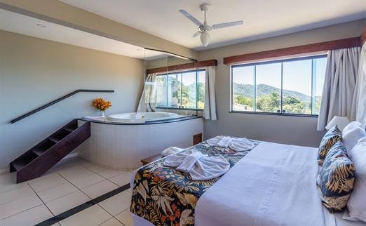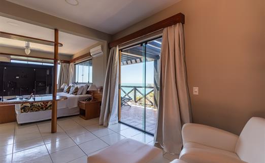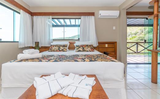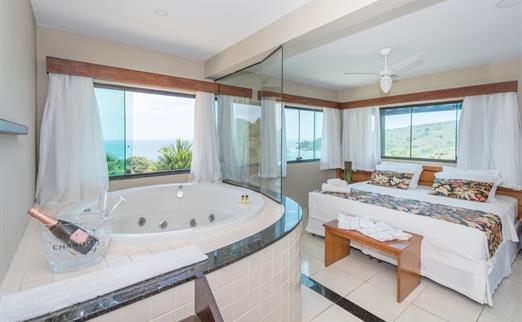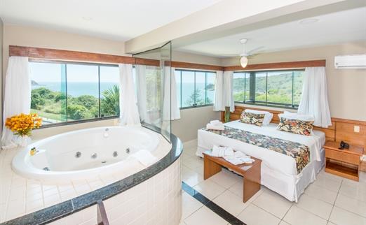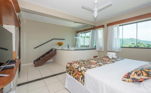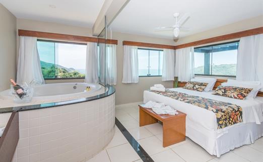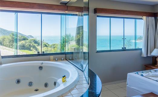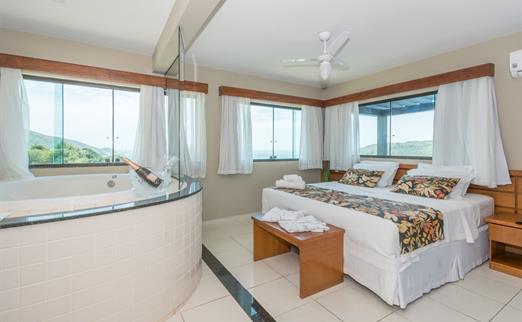 A Suite Master é nossa top suite, também chamada de executiva, possui uma banheira de hidromassagem dupla dentro do quarto e uma vista do mar de tirar o fôlego ,possui cama de casal KING size box, além de uma aconchegante salinha de estar, equipada com ar condicionado, frigobar, cofre, televisão 42" (canais abertos e a cabo), amenites, roupão, roupa de banho e cama, e uma varanda com espreguiçadeiras e uma belissima vista para o mar da praia Brava. Essa opção temos no segundo prédio da pousada, ideal para casais, queridinha dos apaixonados, lua de mel e comemorações, mas também pode receber até quatro pessoas (cama casal + 2 camas...