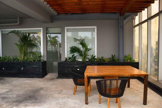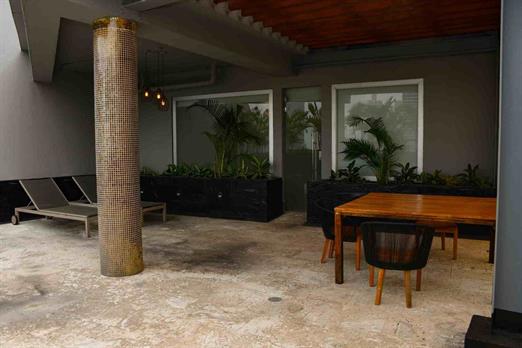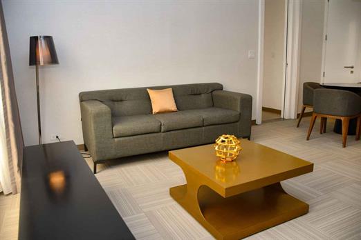 • Sala-comedor con sofá, mesa de centro, mesa de comedor con cuatro sillas, escritorio y mueble multifunción.