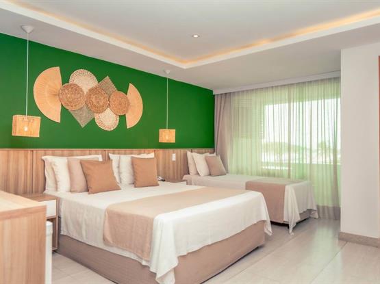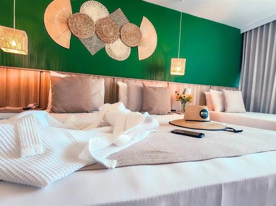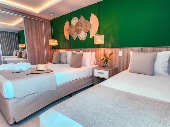 Acomode-se confortavelmente na espaçosa cama para três adultos, com espaço para uma criança até 5 anos, que é nossa cortesia ao dormir na mesma cama dos pais. As comodi...