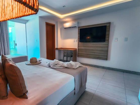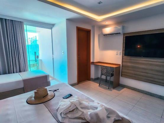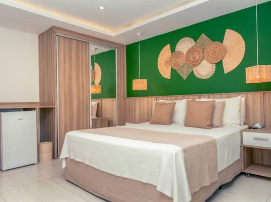 Acomode-se confortavelmente na espaçosa cama para três adultos, com espaço para uma criança até 5 anos, que é nossa cortesia ao dormir na mesma cama dos pais. As comodidades modernas incluem ar-condicionado split, frigobar, armário, TV de LED com canais a cabo, garantindo conforto e entretenimento durante toda a sua estadia.