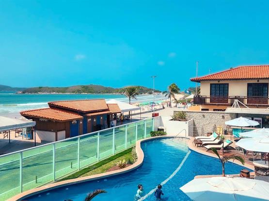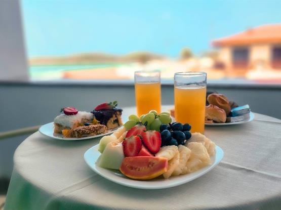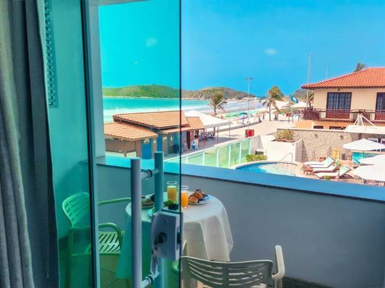 Explore nosso espaço de 24m², completo com uma varanda equipada com mesa e cadeiras, oferecendo uma vista lateral encantadora do mar.