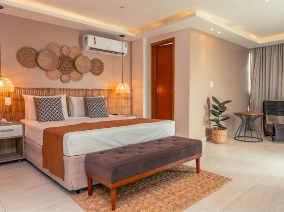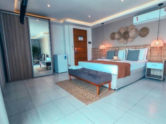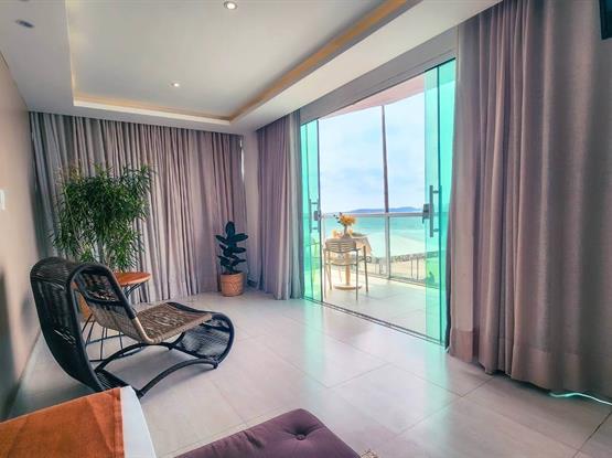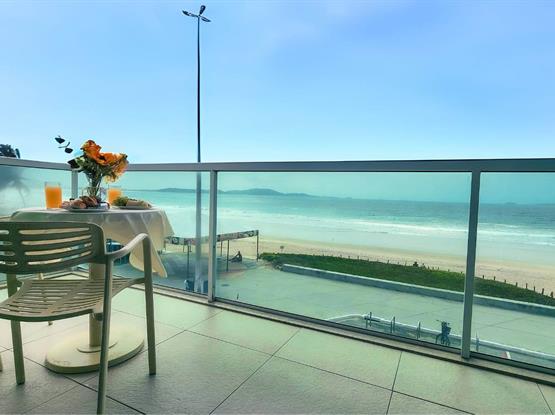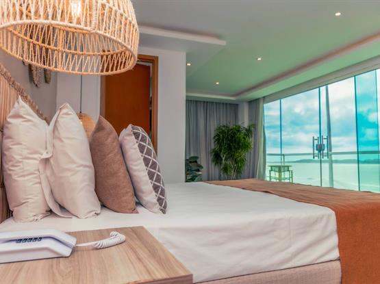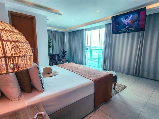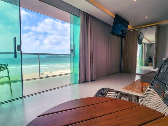 Adentre nossa Suíte Premium de 26m², onde cada detalhe foi pensado para oferecer conforto e praticidade em um ambiente à beira-mar. Aproveite a vista deslumbrante diretamente da varanda, equipada com mesa e cadeiras para momentos relaxantes com vista para o mar.