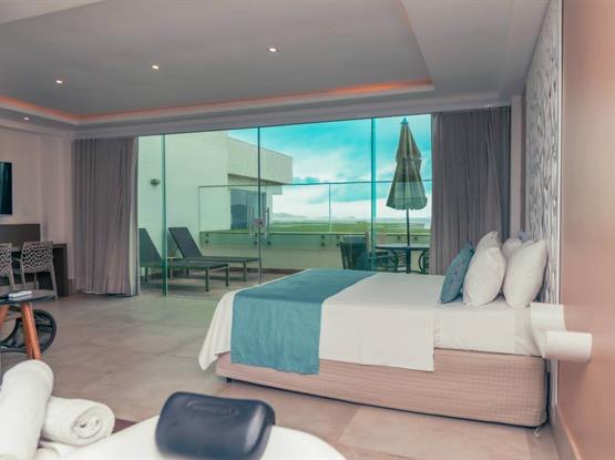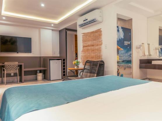 Entre em nossa suíte espaçosa de 48m², onde a decoração moderna e aconchegante criam o ambiente perfeito para uma estadia memorável à beira-mar.