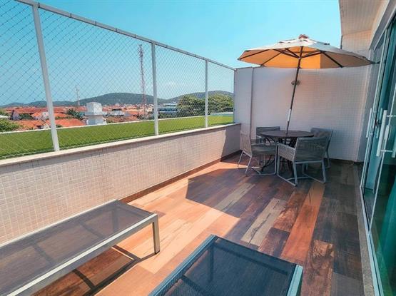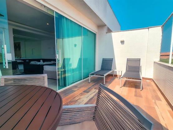 A varanda privativa está equipada com mesa e cadeiras, proporcionando um ambiente perfeito para um café da manhã sereno ou um momento de contemplação ao entardecer.