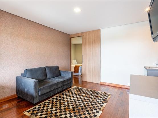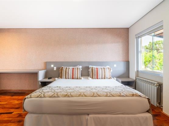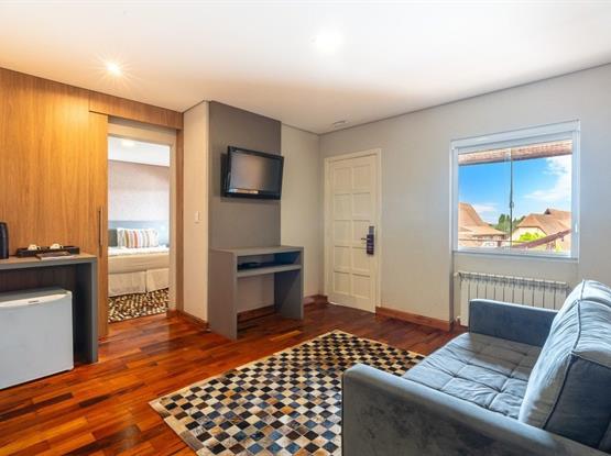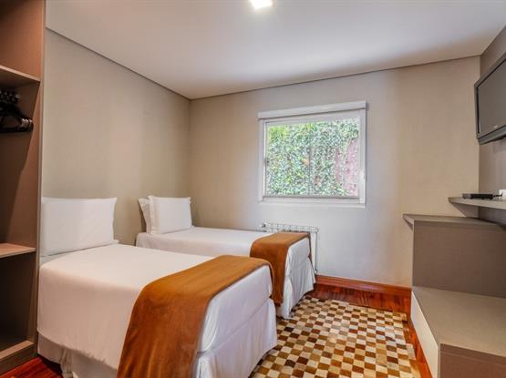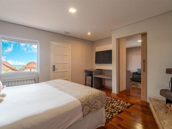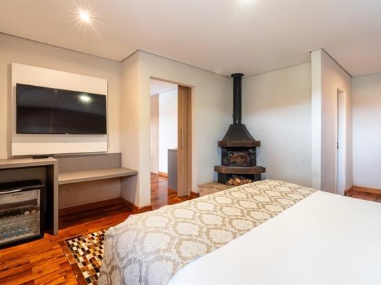 O Standard Externo Quádruplo é um charmoso chalé localizado na parte externa do hotel, a aproximadamente 40 metros do prédio principal. O apartamento é dividido em três ambientes: uma sala de estar, um quarto de casal amplo com lareira e um segundo quarto com duas camas de solteiro. Cada dormitório conta com banheiro privativo, oferecendo mais conforto e praticidade para todos os hóspedes e conta com sistema de calefação para aquecimento do ambiente.