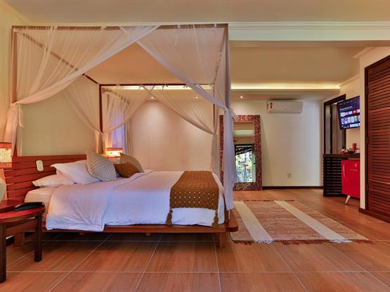 Experiencie a sofisticação e exclusividade do nosso quarto Master Luxo que conta com Banheira de Hidromassagem Dupla com Aquecedor. Desfrute da Cama Super King Especial com Dossel, Roupas de Cama Premium e Amplos Espelhos de Corpo, criando um ambiente de requinte e conforto. A Iluminação interna aprimora a atmosfera acolhedora e relaxante. A presença da Máquina de Café Expresso 3 Corações e Taças para Espumante acrescenta comodidade extra. Adicionalmente, oferecemos serviços como Café da Manhã Personalizado na Varanda e Decorações Românticas para tornar sua estadia mais memorável (mediante custo adicional).