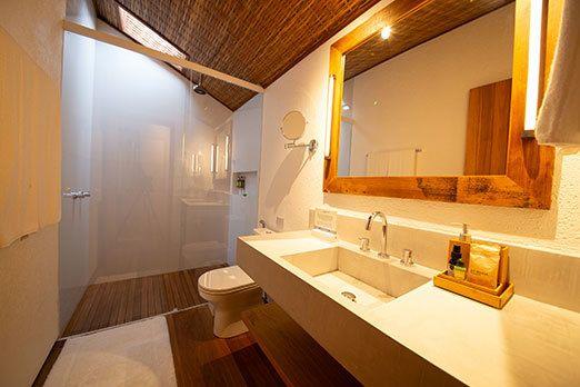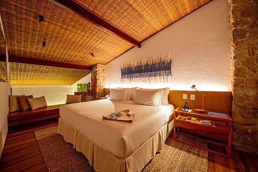 Pequena casa colonial de 130 m², reformada e integrada ao casario principal. A fachada é para a rua, mas para maior privacidade, o acesso se faz pela entrada principal da pousada. São dois andares: no primeiro, sala de estar com sofá, poltrona e uma minibiblioteca convidativa para uma tarde mais reservada, cozinha e mesa de jantar de seis lugares. No segundo andar, uma suíte ampla e charmosa, e um banheiro conta com um chuveiro delicioso. Acomoda confortavelmente um casal e pode receber camas adicionais.