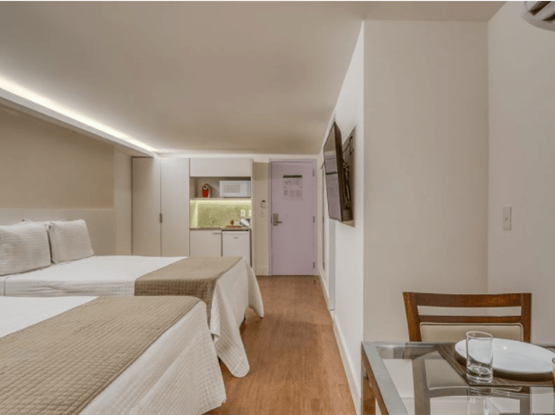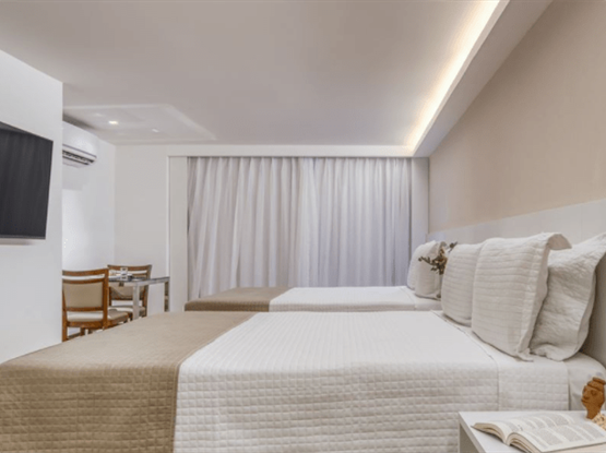 Este quarto fica localizado no primeiro andar e não possui vista para o mar. Possui, aproximadamente, 40m². É configurado para até quatro adultos e tem apenas duas camas de casal no mesmo ambiente. Não dispõe de camas extras. Neste quarto é possível acomodar 1 criança grátis de até 2 anos de idade de acordo com a política do hotel. Esta criança será acomodada nas camas pré existentes (casal). Em caso de dúvidas entrar em contato com o setor de reservas: