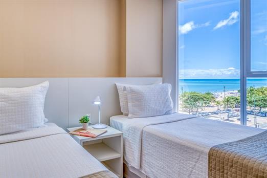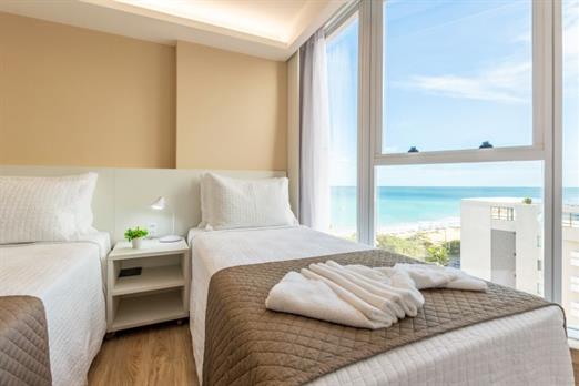 Este quarto possui, aproximadamente, 22 m² e tem vista lateral para o mar. É configurado para até dois adultos e tem apenas duas camas de solteiro. Não dispõe de camas extras. Neste quarto é possível acomodar 1 criança grátis de até 2 anos de idade de acordo com a política do hotel. Esta criança será acomodada nas camas pré existentes (solteiro). Em caso de dúvidas entrar em contato com o setor de reservas: