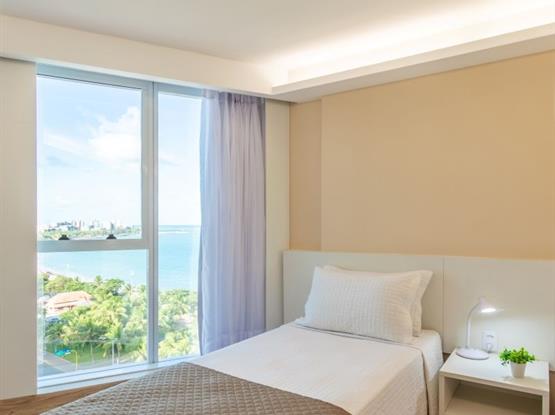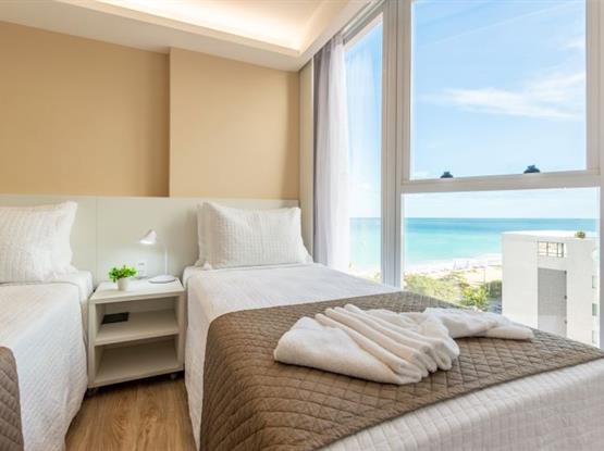 Este quarto possui, aproximadamente, 22 m² e tem vista lateral para o mar. É configurado para até dois adultos e tem apenas duas camas de solteiro. Não dispõe de camas extras. Neste quarto é possível acomodar 1 criança grátis de até 2 anos de idade de acordo com a política do hotel. Esta criança será acomodada nas camas pré existentes (solteiro). Em caso de dúvidas entrar em contato com o setor de reservas: